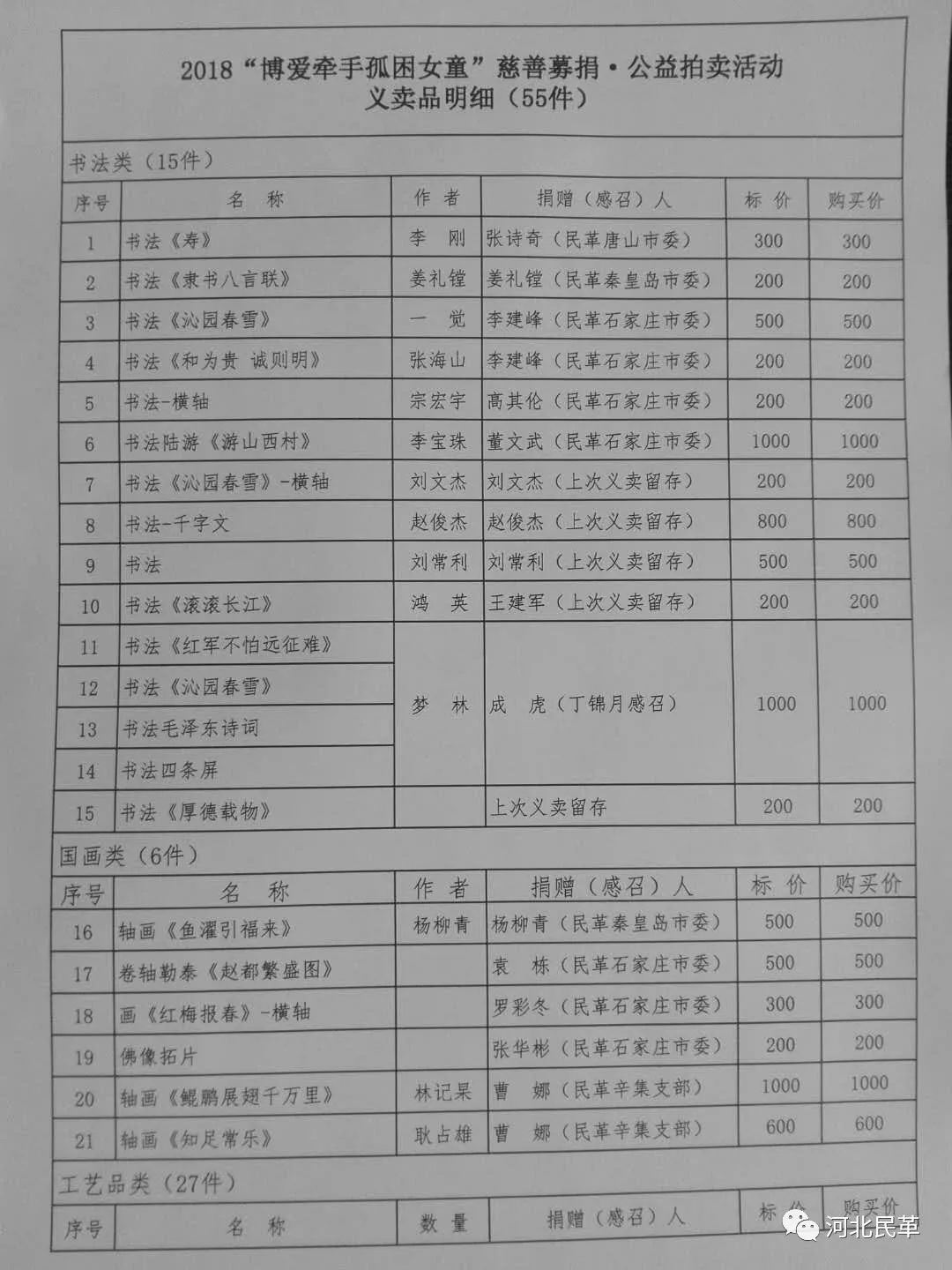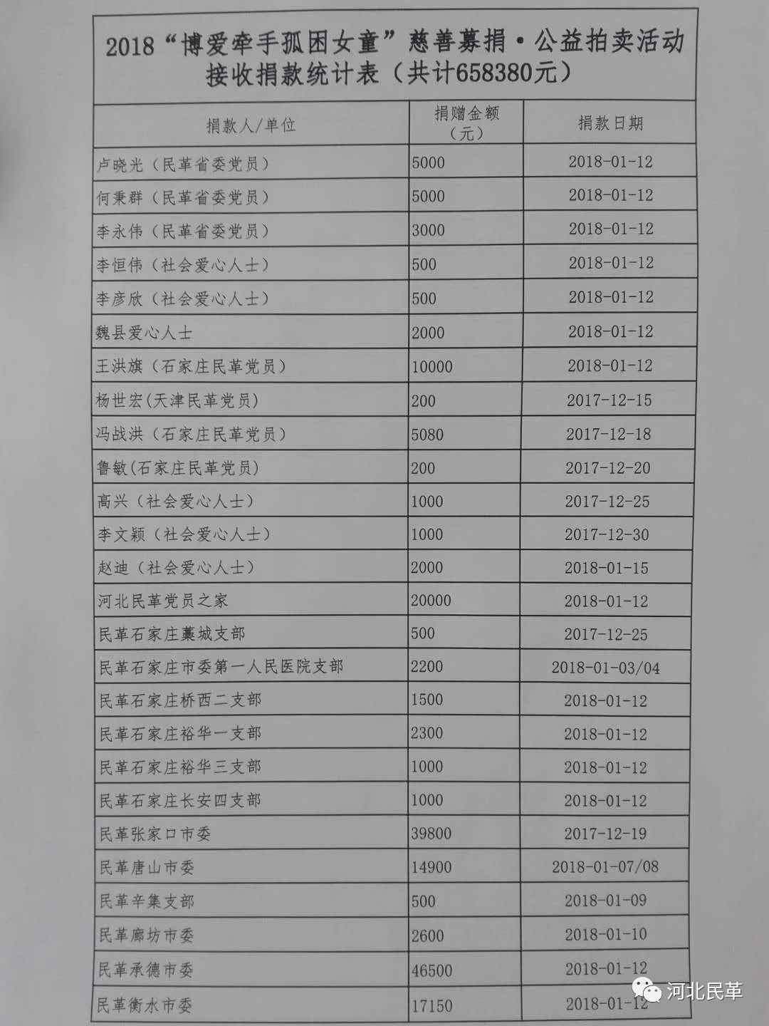 2018“博愛牽手孤困女童”公益拍賣活動(dòng)已圓滿結(jié)束,本次活動(dòng)受到了廣大民革黨員和社會(huì)各界愛心人士的熱情支持,為將慈善活動(dòng)持續(xù)下去,民革省委將繼續(xù)接收愛心捐款、捐物,捐物將用于后續(xù)義拍義賣。截至2018年1月30日,共接收捐款658380元,接收捐物268件。其中,義拍品61件拍得善款765000元,義賣品賣出55件籌得善款21941元,剩余160件捐贈(zèng)物已登記在冊(cè)留存省委會(huì),用于今后的義拍義賣活動(dòng)?,F(xiàn)將捐款、捐物情況公示如下,接受各界愛心人士監(jiān)督。