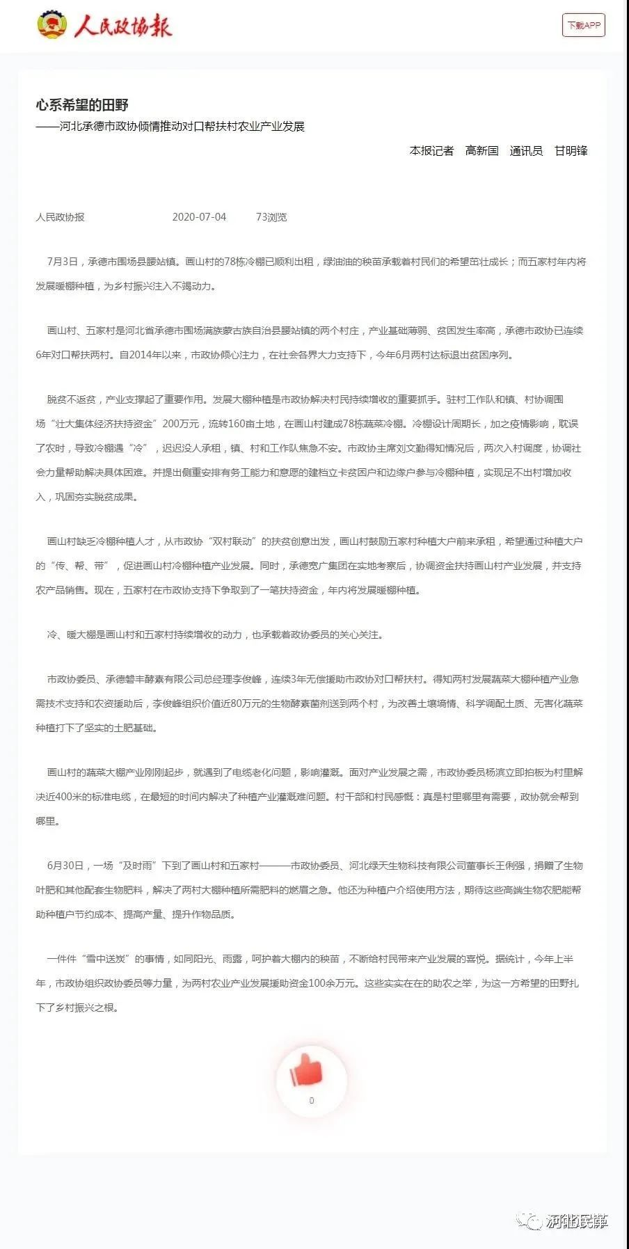 7月4日,以《心系希望的田野——河北承德市政協(xié)傾情推動對口幫扶村農(nóng)業(yè)產(chǎn)業(yè)發(fā)展》為題,《人民政協(xié)報》、人民政協(xié)網(wǎng)、河北政協(xié)網(wǎng)、承德政協(xié)網(wǎng)等多家媒體對此事進(jìn)行了報道。