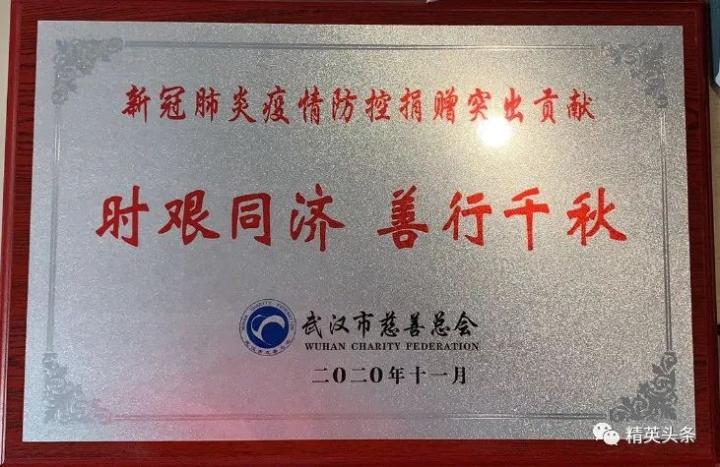 祝賀!精英集團(tuán)被武漢市慈善總會授予“新冠肺炎疫情防控捐贈突出貢獻(xiàn)”牌匾