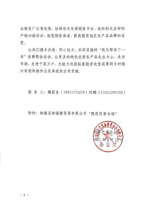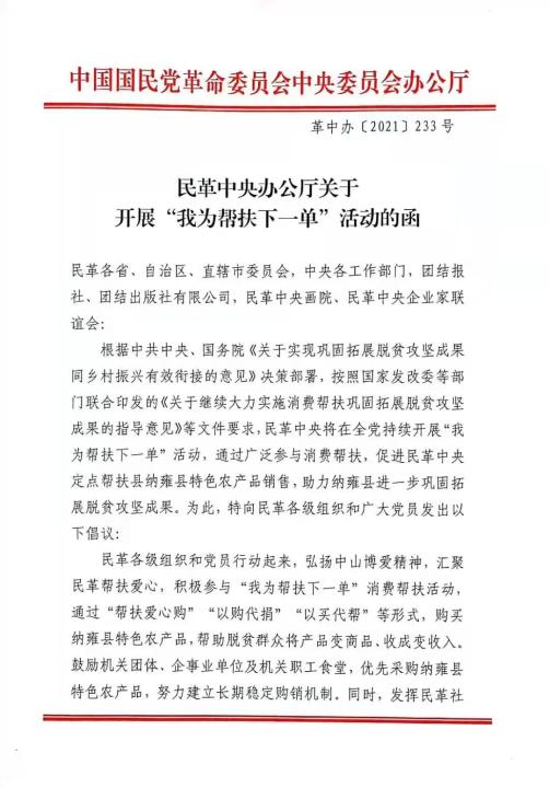 近日,民革中央辦公廳發(fā)出關(guān)于開展“我為幫扶下一單”活動(dòng)的函》。倡議指出,民革中央將在全黨持續(xù)開展“我為幫扶下一單”活動(dòng),通過廣泛參與消費(fèi)幫扶,促進(jìn)民革中央定點(diǎn)幫扶縣納雍縣特色農(nóng)產(chǎn)品銷售,助力納雍縣進(jìn)一步鞏固拓展脫貧攻堅(jiān)成果。