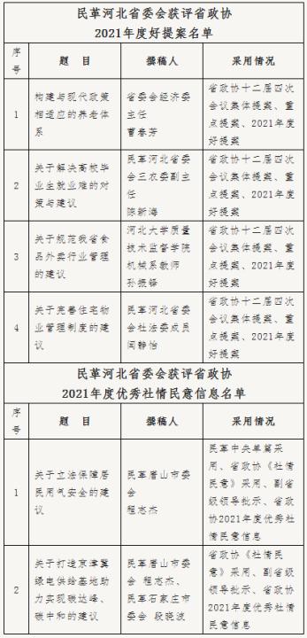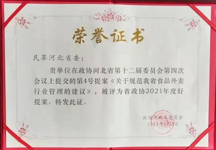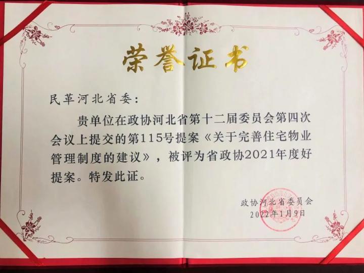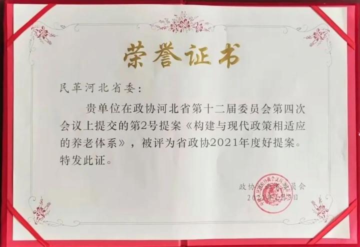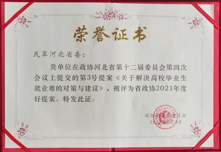 1月9日,在政協(xié)河北省第十二屆委員會(huì)常務(wù)委員會(huì)第二十四次會(huì)議上,民革河北省委會(huì)榮獲河北省政協(xié)2021年度4件好提案、2篇優(yōu)秀社情民意信息。
