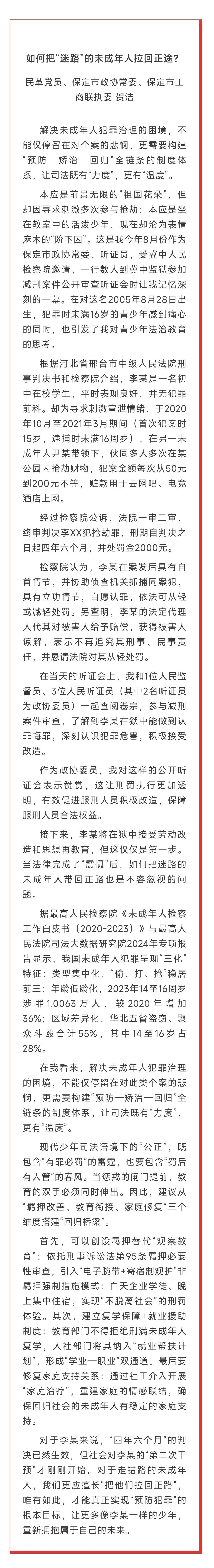 11月6日,《人民政協(xié)報(bào)》刊登民革黨員、保定市政協(xié)常委、保定市工商聯(lián)執(zhí)委賀潔文章《如何把“迷路”的未成年人拉回正途?》。該文以典型案例為切入點(diǎn),深入剖析未成年人犯罪治理難題,系統(tǒng)構(gòu)建了“預(yù)防—矯治—回歸”的全鏈條治理體系,所提建議具有前瞻性與實(shí)踐價(jià)值?,F(xiàn)轉(zhuǎn)載文章如下,供學(xué)習(xí)參考。