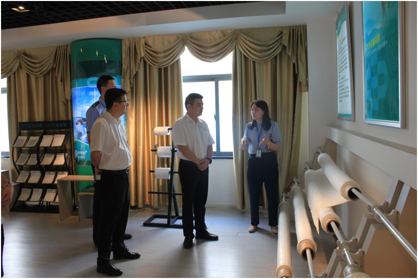 張副院長一行首先參觀了公司的產品展廳,朱主任向張副院長等領導匯報了公司的各類產品、生產經營、公司榮譽、技術研發等,其中重點介紹了公司主打的PTFE親水膜、疏水膜、服裝膜、鋰電池隔膜等高科技產品,其多個產品填補國內空白達到國際領先水平,公司還被評為國家專精特新“小巨人”企業榮譽稱號。